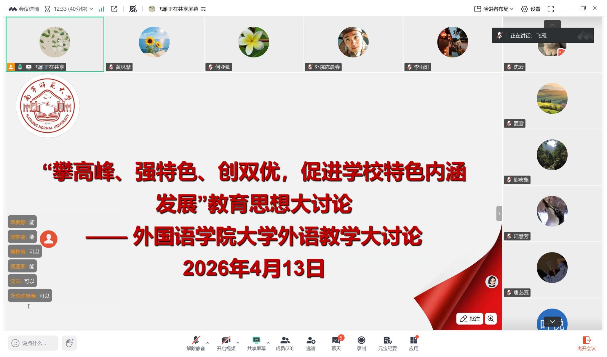 大学外语教学部以腾讯会议形式,开展“攀高峰、强特色、创双优,促进学校特色内涵发展”教育思想大讨论,扎实落实学校“1395总体发展战略”,推动GG扑克