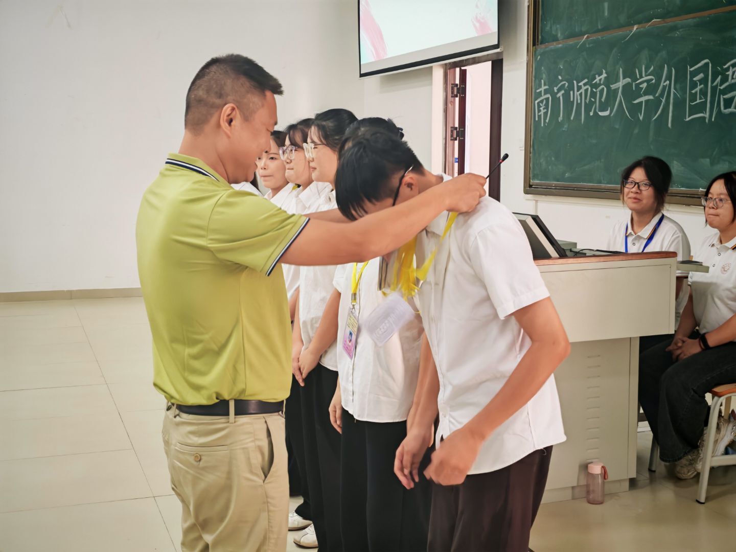 致辞结束后,大会进入授牌环节。首先是刘副书记为团副主席团成员授予工作牌,团副主席团随后为各部门工作人员授牌,各部门工作人员再为本部门志愿者授牌。层层递进的授牌仪式,象征着责任与使命的传递。在自我介绍环节,志愿者们满怀热忱,言语间充满了对未来工作的憧憬与热爱,也让现场师生对这批新生力量有了初步的了解。