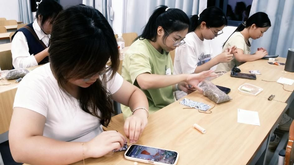 活动伊始,会长黄倩倩向同学们娓娓道来重阳节的文化深意,详细讲解了佩戴香囊所寄寓的健康祝福与美好期盼。随着对这一传统节日文化内涵的理解不断加深,同学们亲手制作香囊的渴望愈发强烈。我院青协精心准备了各式花布、彩绳、针线以及艾草、丁香等中草药,无论是初次执针的“新手”,还是技艺娴熟的“巧手”,皆齐聚一堂,共同投入到香囊的制作之中。
