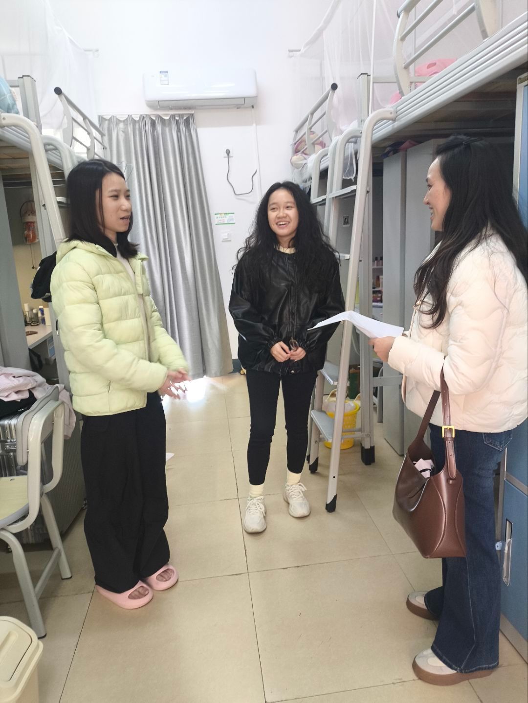 此次走访聚焦宿舍安全与卫生两大核心,重点排查大功率电器、私拉乱接电线、违规使用明火等安全隐患,同时检查宿舍内务整理、卫生清洁、物品摆放及垃圾分类等情况。走访中,领导、辅导员与学生“拉家常”,问学业、聊就业,亲切细心询问大家的近况,提醒大家增强防火、防盗、防触电意识,各宿舍做到人走断电、门窗上锁,贵重物品妥善保管,确保宿舍安全。